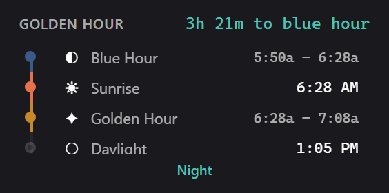 Never miss the perfect light again. See exactly when golden hour and blue hour start and end at your location, updated daily. Essential for photographers, filmmakers, and anyone who chases beautiful light.