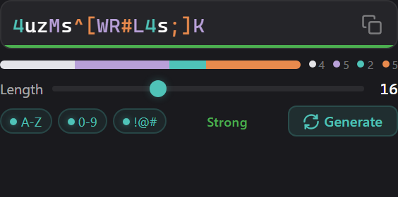 - Customizable length and character types (uppercase, lowercase, numbers, symbols)